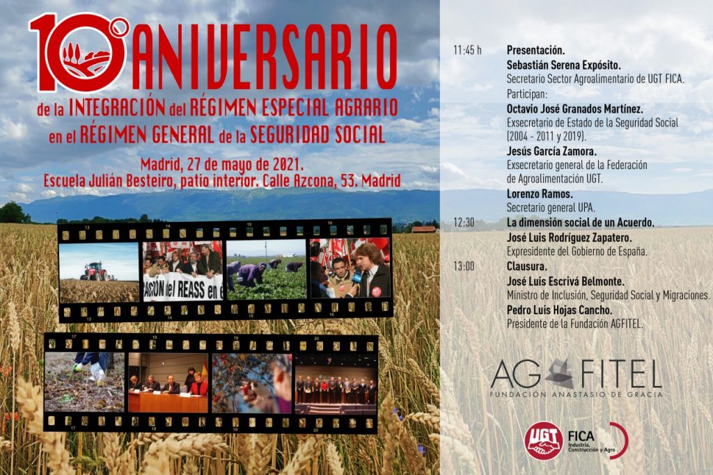 La Fundación Anastasio de Gracia-FITEL (AGFITEL) y UGT FICA han organizado conjuntamente un acto para conmemorar el 10º Aniversario de la Integración del Régimen Especial Agrario en el Régimen General de la Seguridad Social. La jornada, que se va a desarrollar en el patio interior de la Escuela Julián Besteiro de Madrid (Cl. Azcona, 53), podrá seguirse en streaming desde youtube o desde la web de la Fundación (http://agfitel.es), o directamente desde la Escuela Julian Besteiro, previa solicitud de acreditación.