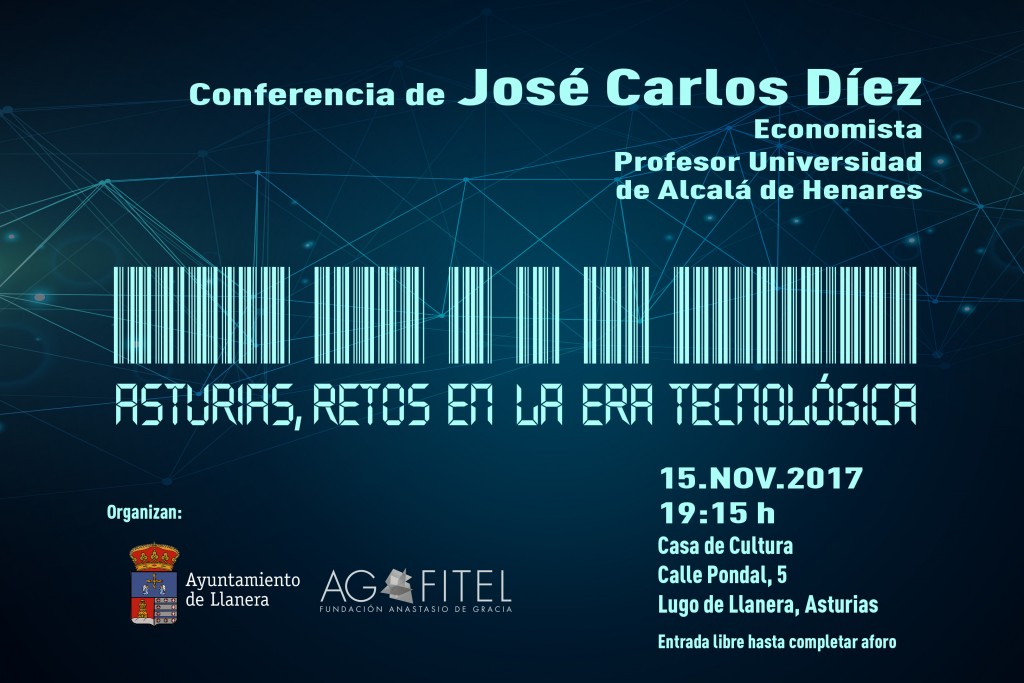 El ayuntamiento de Llanera y la Fundación Anastasio de Gracia-FITEL, organizan la Conferencia “Asturias, retos en la era tecnológica”, que impartirá D. José Carlos Díez, economista y profesor de la Universidad de Alcalá de Henares, el próximo día 15 de noviembre de 2017 a las 19:15 horas, en la Casa de la Cultura de Lugo Llanera, calle Pondal, 5, Lugo de Llanera (Asturias).