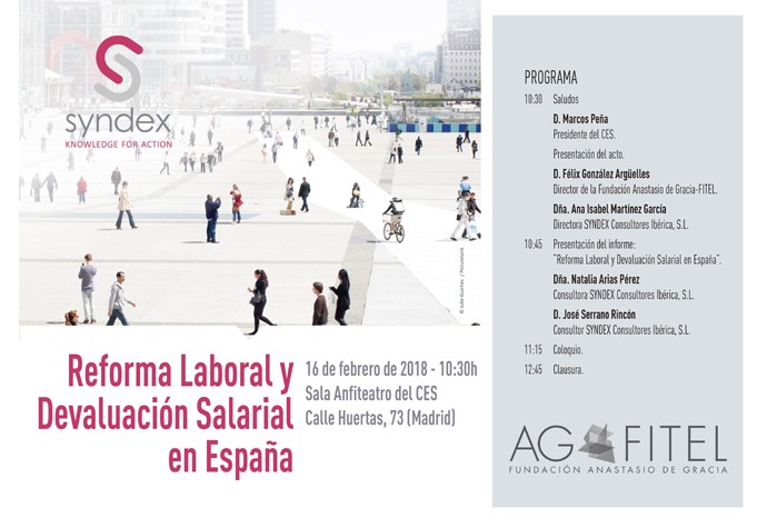 La Fundación Anastasión de Gracia-FITEL organiza a partir de las 10:30 h. del próximo 16 de febrero, en la sala Anfiteatro del Consejo Económico Social, cl. Huertas,23 de Madrid, la presentación del informe realizado por SYNDEX Consultores Ibérica, S.L. Reforma Laboral y devaluación salarial en España.