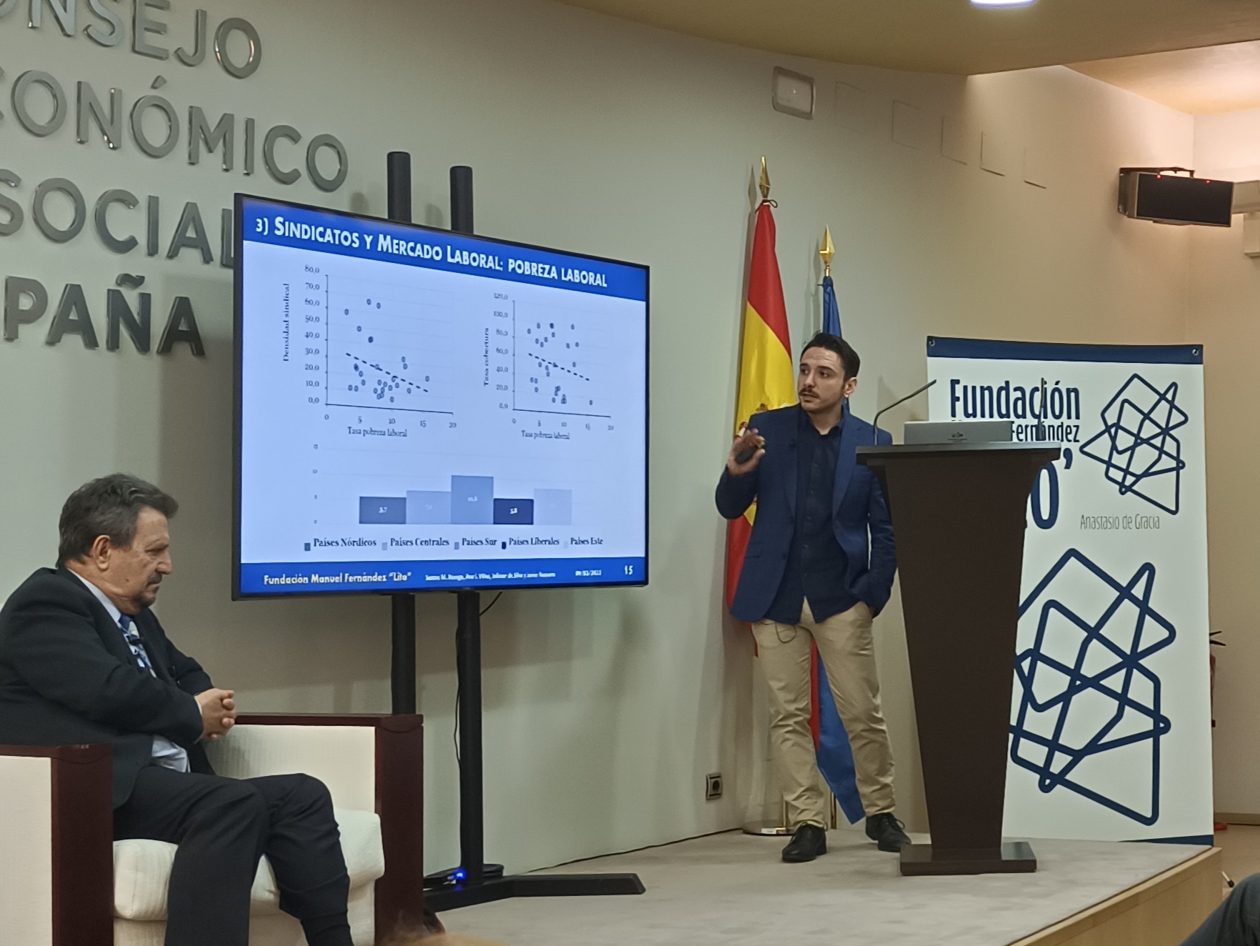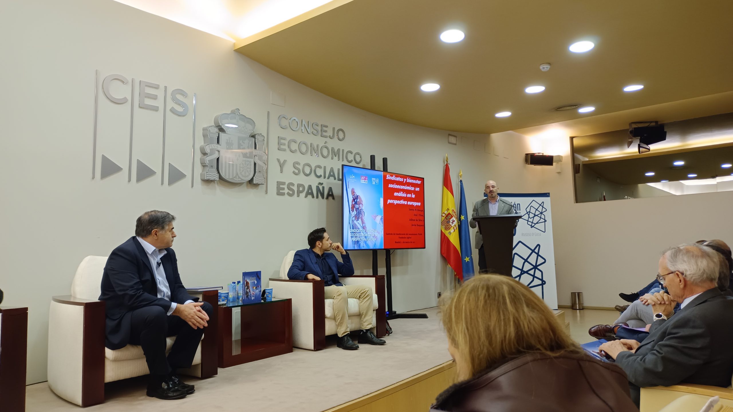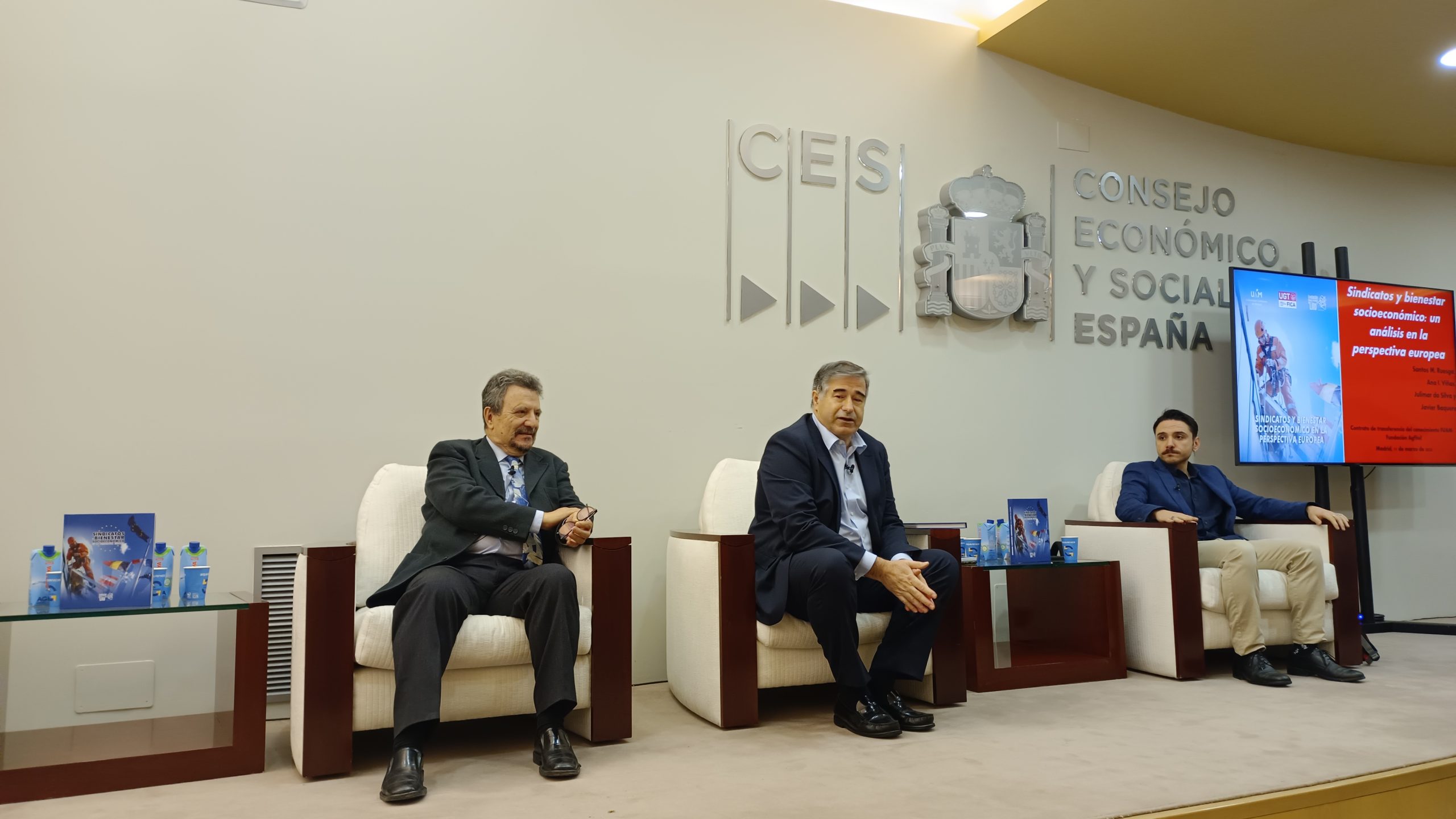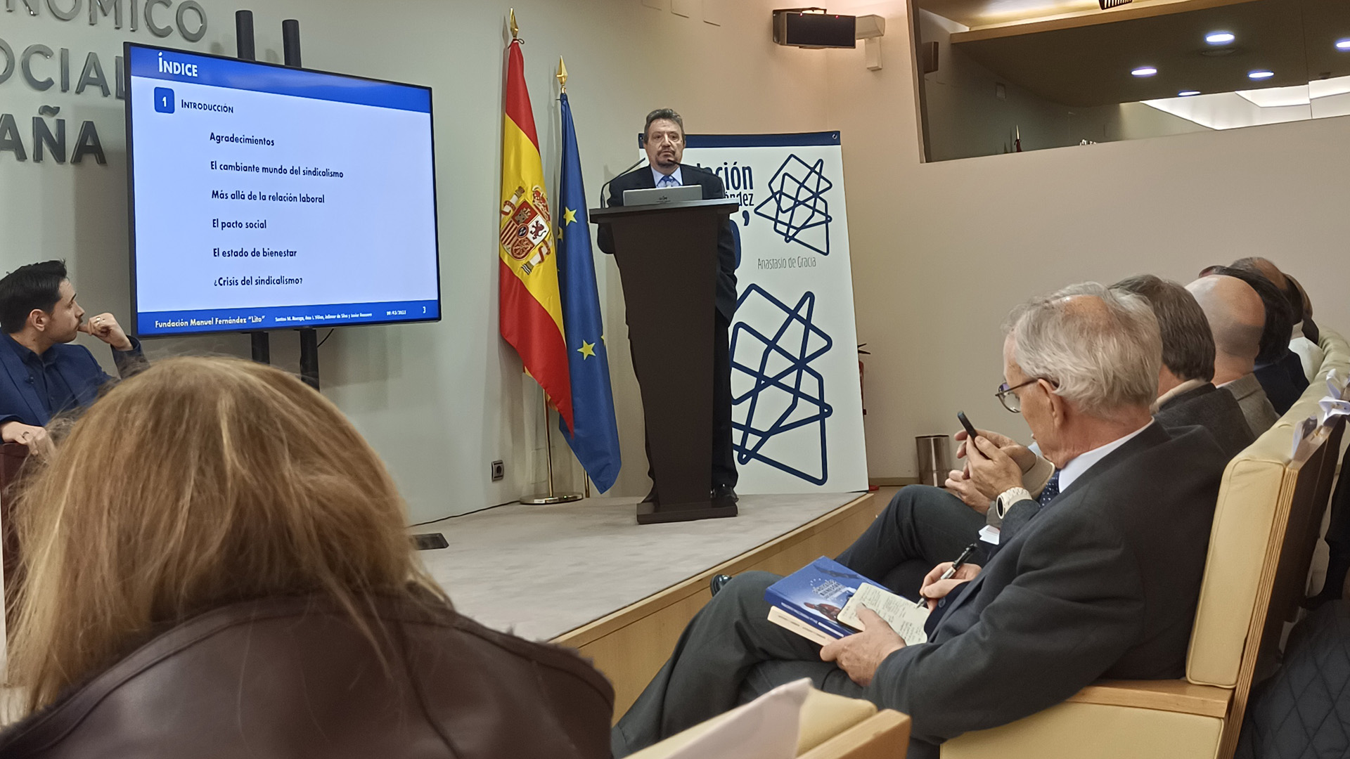 Presentación del libro Sindicatos y bienestar socioeconómico en la perspectiva europea, que recoge el estudio realizado por el equipo de la Universidad Autónoma de Madrid (UAM) formado por el doctor en Ciencias Económicas Santos M. Ruesga; los doctores en Ciencias Económicas y Empresariales, Ana I. Viñas y Julimar da Silva, y el doctor internacional en Ciencias Económicas y Empresariales, Javier Baquero y que se publica ahora, editado por la Fundación Manuel Fernández «Lito».