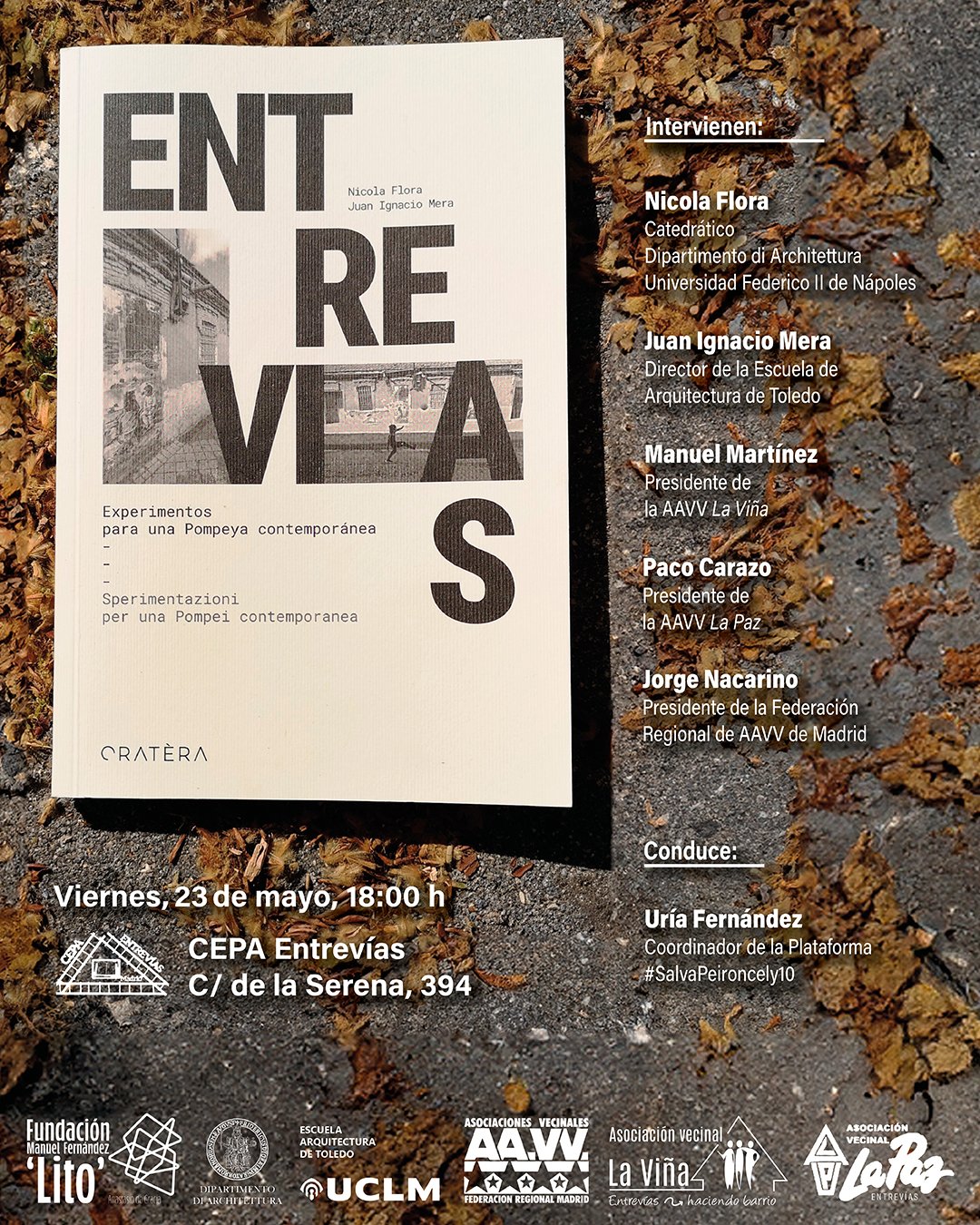 El viernes 23 de mayo, en un evento organizado por la Fundación Anastasio de Gracia, se presentó en el CEPA de Entrevías el libro Entrevías: experimentos para una Pompeya contemporánea obra de Nicola Flora y Juan Ignacio Mera, publicado por la editorial italiana Cratera.