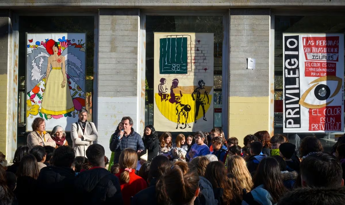 Niños y jóvenes de colegios del sur de Madrid convierten una pared del Renfe de Entrevías en un símbolo contra la discriminación y la xenofobia