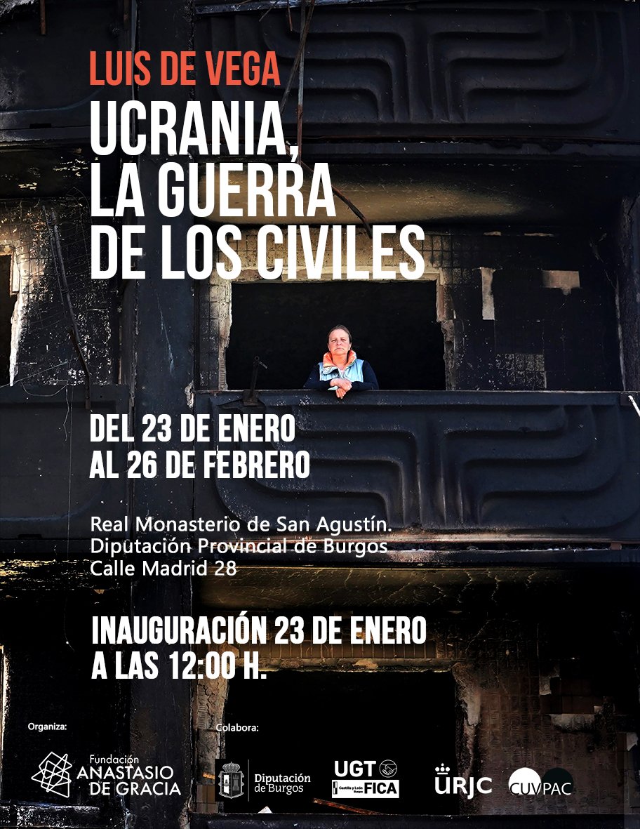 Mañana martes, 23 de enero a las 11.30 horas, se inaugura la exposición Ucrania, la guerra de los civiles, obra del reportero y fotógrafo de El País, Luis de Vega (Huelva, 1971), organizada por la Fundación Anastasio de Gracia y UGT FICA, en las salas del Real Monasterio de San Agustín, propiedad de la Diputación Provincial de Burgos.