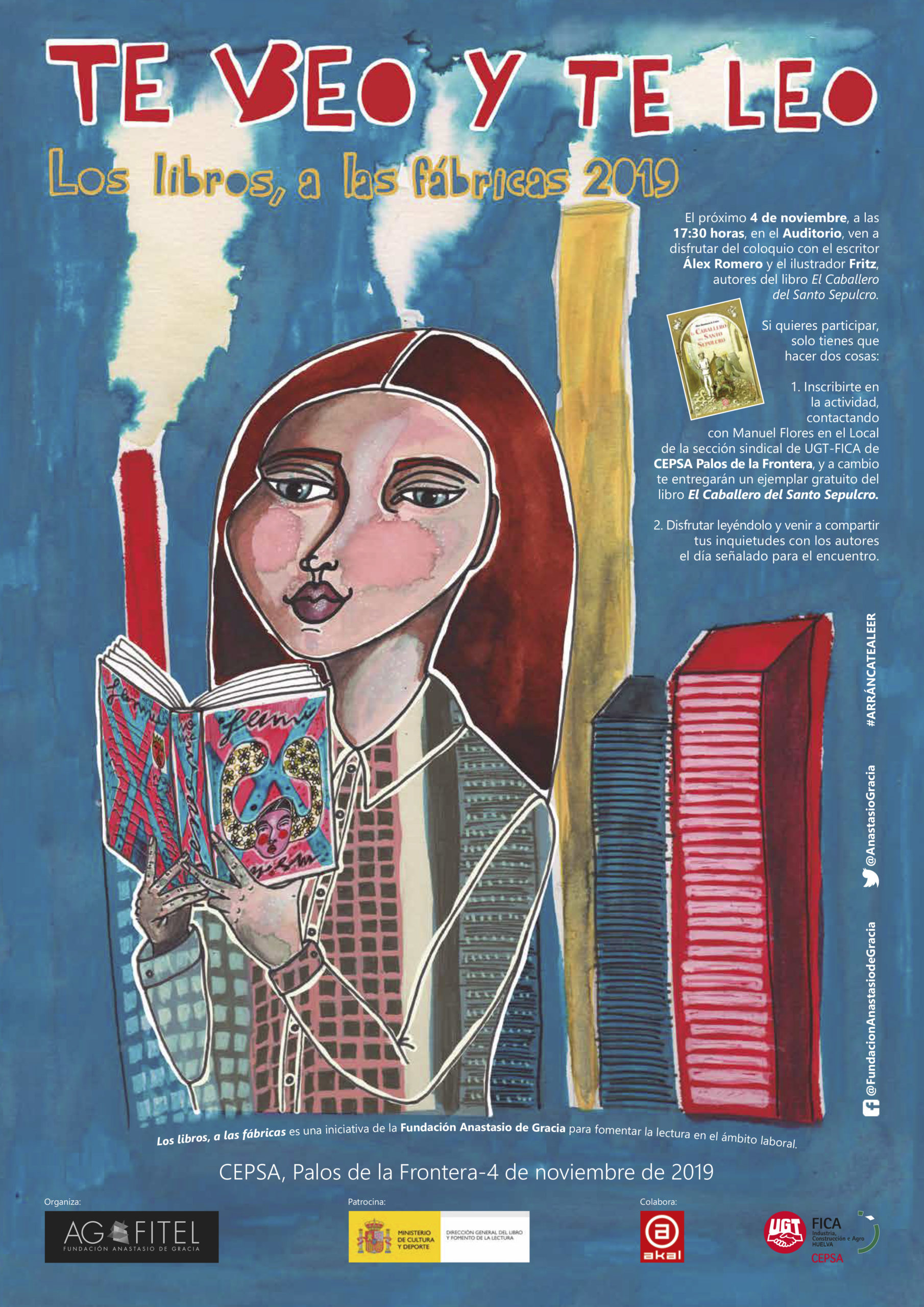 El próximo lunes 4 de noviembre a las 17.30 horas, el escritor Alex Romero y el ilustrador Fritz se reunirán con los trabajadores de la empresa Cepsa (Palos de la Frontera, Huelva). El acto englobado en la sexta edición de Los libros, a las fábricas, forma parte de un proyecto diseñado por el Centro Documental de la Fundación Anastasio de Gracia para incrementar el número de lectores de nuestro país, donde cerca de un 40 % de la población manifiesta sin rubor «no haber leído nunca un libro».