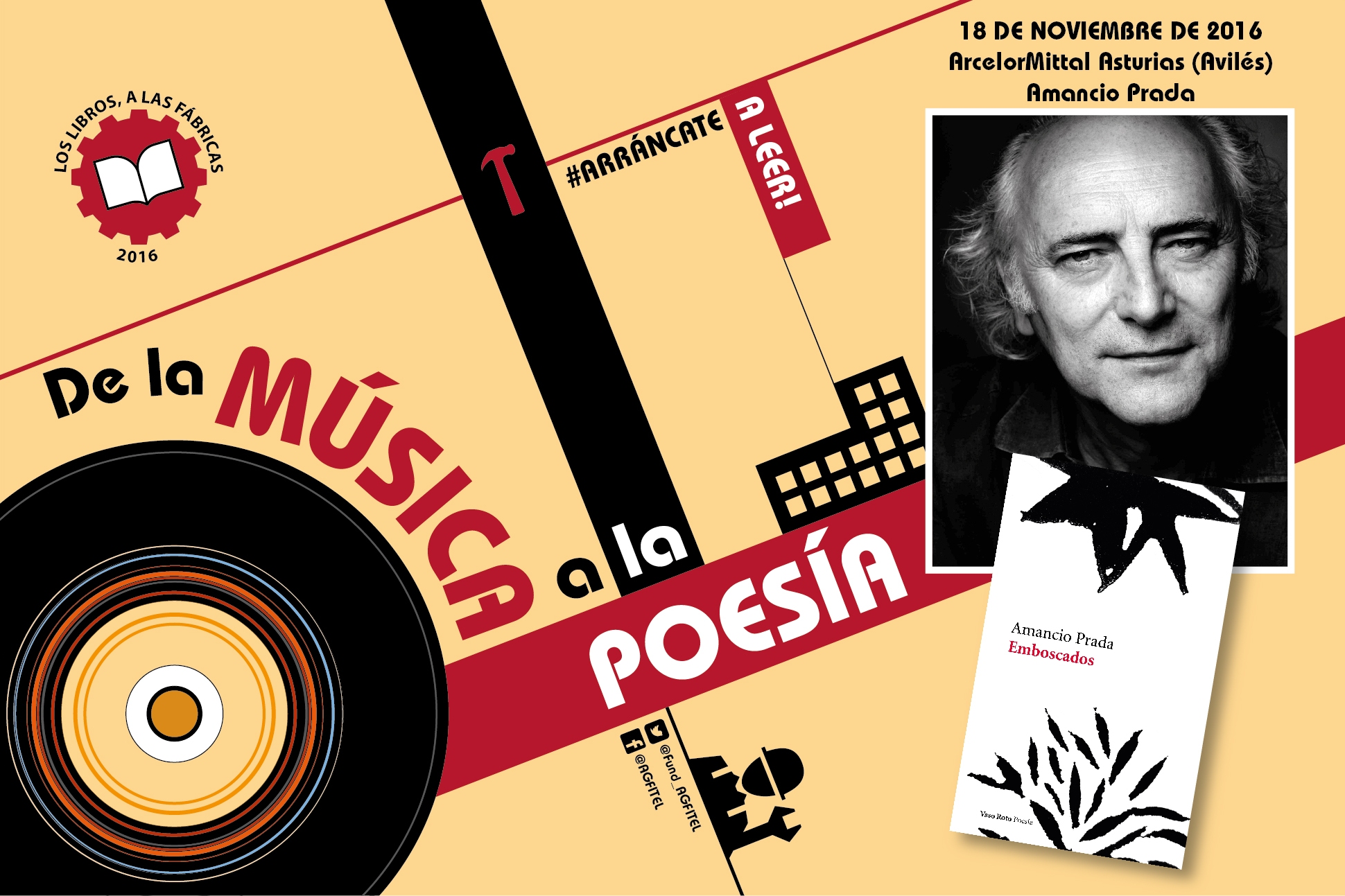 El próximo 18 de noviembre Amancio Prada departirá con los trabajadores de ArcelorMittal Avilés en torno a su libro-disco titulado «Emboscados», publicado por Vaso Roto Ediciones. Este acto forma parte de la campaña de Los libros, a las fábricas, 2016, organizada por la Fundación Anastasio de Gracia-FITEL, y que este año bajo el título «De la música, a la poesía» llevará a nueve cantautores y poetas a otras tantas factorías industriales con la misión de fomentar la lectura en verso.