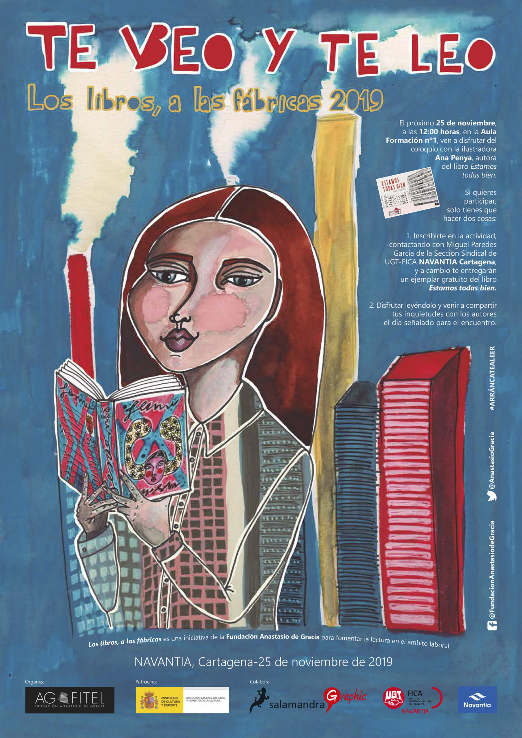 El próximo lunes 25 de noviembre a las 12.00 horas, la ilustradora Ana Penyas se reunirá con los trabajadores de la empresa Navantia, Cartagena (Murcia). El acto englobado en la sexta edición de Los libros, a las fábricas, forma parte de un proyecto diseñado por el Centro Documental de la Fundación Anastasio de Gracia para incrementar el número de lectores de nuestro país, donde cerca de un 40 % de la población manifiesta sin rubor «no haber leído nunca un libro».