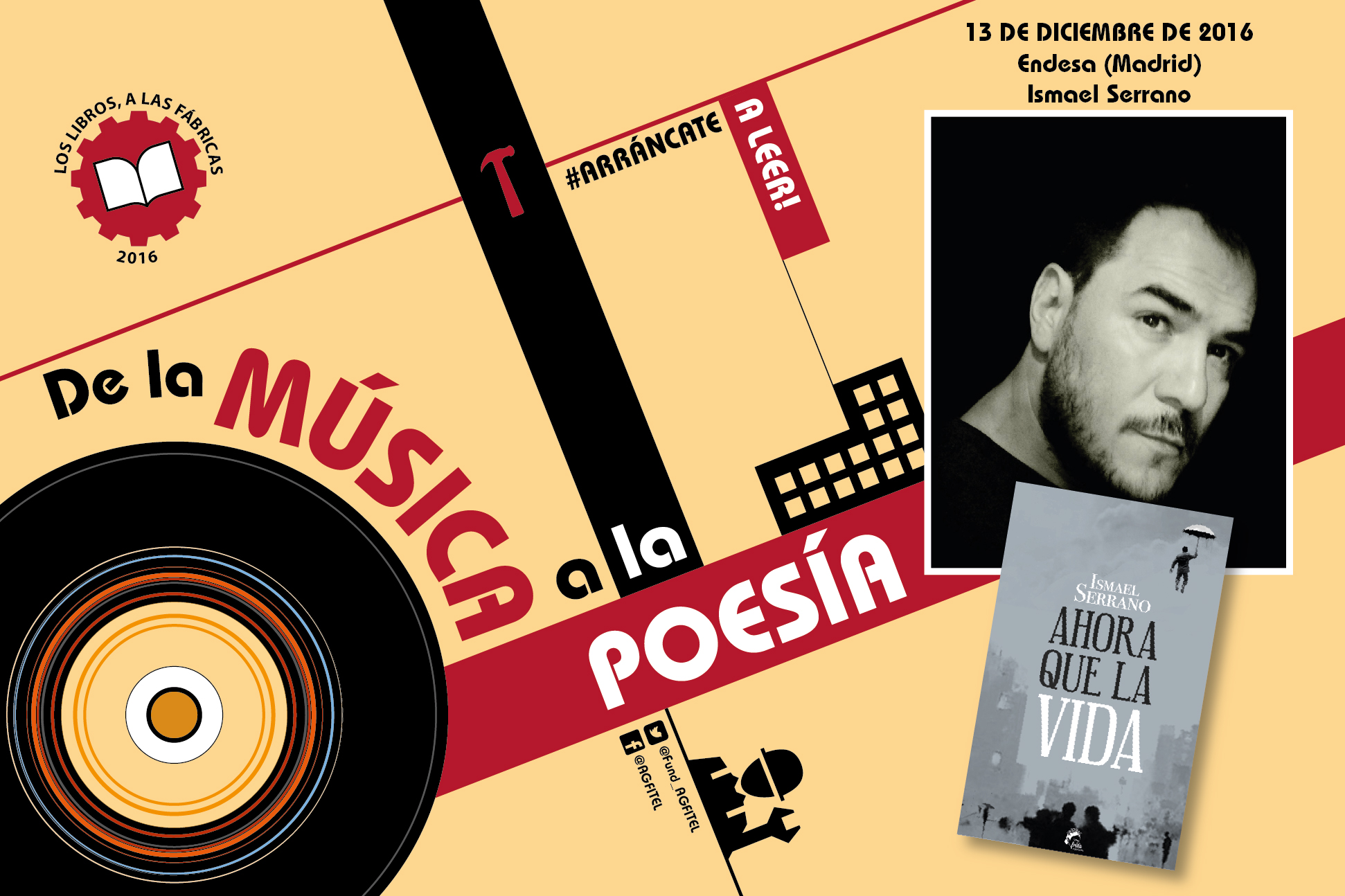 El próximo 13 de diciembre, el cantautor y poeta Ismael Serrano mantendrá un coloquio con los trabajadores de la empresa Endesa, en su sede madrileña, en torno a su libro Ahora que la vida, publicado por Frida Ediciones. Este acto forma parte de la campaña de Los libros, a las fábricas, 2016, organizada por la Fundación Anastasio de Gracia-FITEL, y que este año bajo el título «De la música, a la poesía» llevará a nueve cantautores y poetas a otras tantas factorías industriales con la misión de fomentar la lectura en verso.