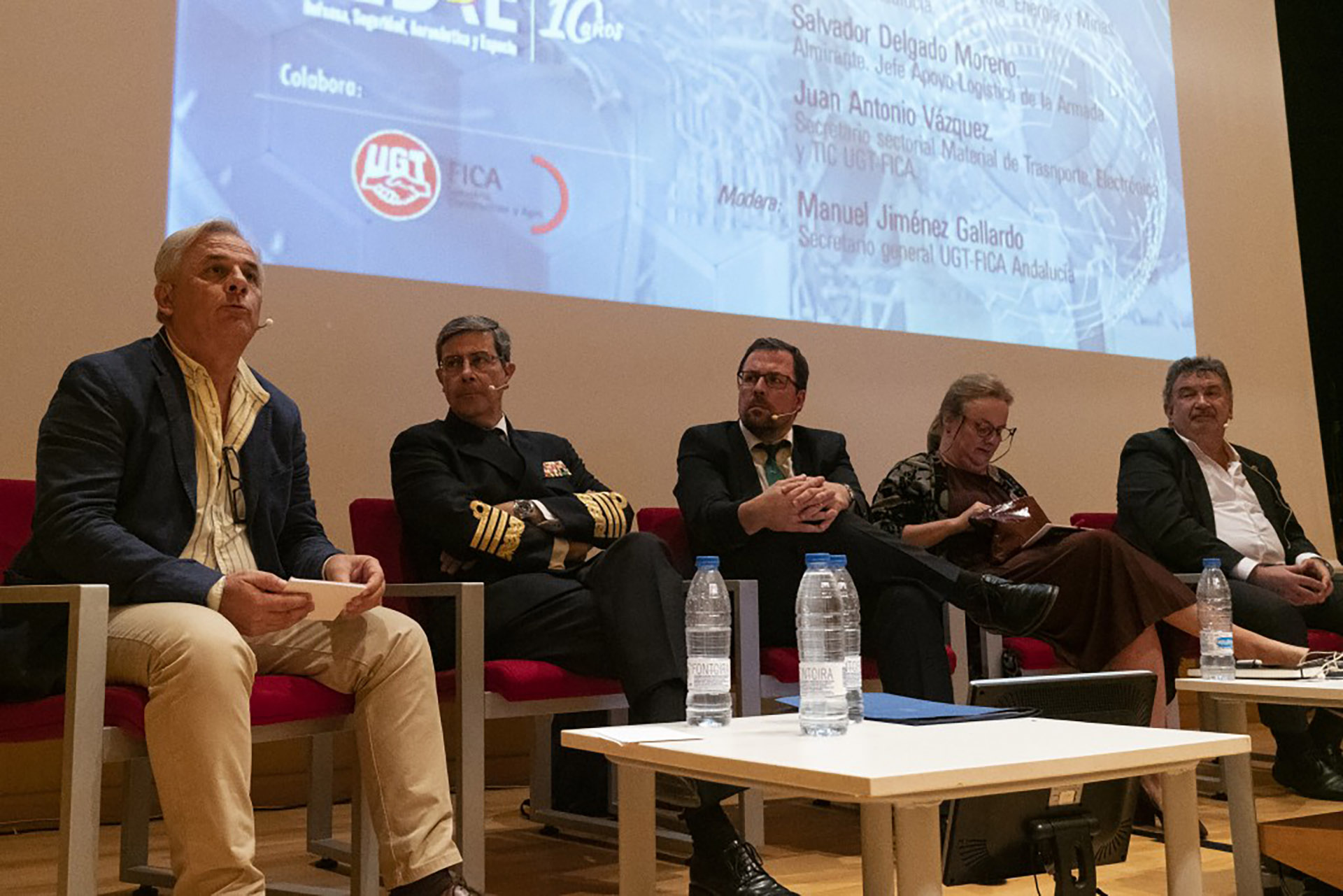 La segunda mesa titulada «Sector de defensa: actividad industrial al servicio de la sociedad y de los ciudadanos» ha contado con las intervenciones del Secretario general de Industria y PYMES. Ministerio de Industria, Comercio y Turismo, Raül Blanco; Domingo Rodríguez Agulleiro, Subdirector general de Ordenación e Innovación de la Formación Profesional del Ministerio de Educación y Formación Profesional; Natalia González Hereza, secretaria general de Industria, Energía y Minas de la Junta de Andalucía, Salvador Delgado Moreno, Almirante. Jefe de Apoyo Logístico de la Armada y Juan Antonio Vázquez, secretario sectorial material de Transporte, Electrónica y TIC de UGT-FICA. La mesa ha sido moderada por Manuel Jiménez Gallardo, secretario general de UGT-FICA Andalucía.
