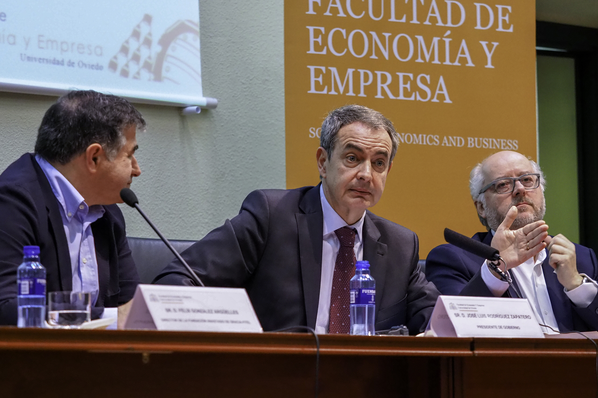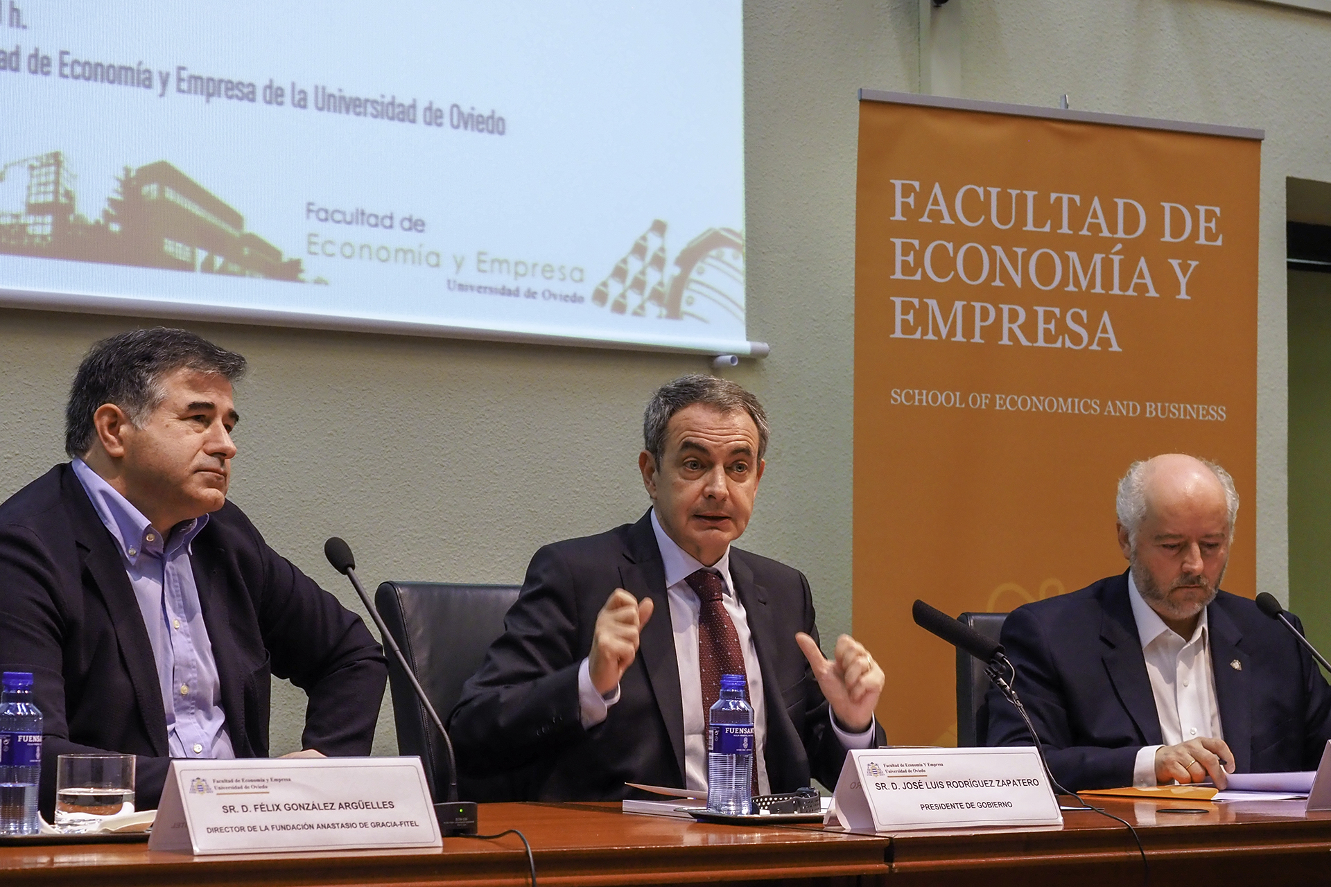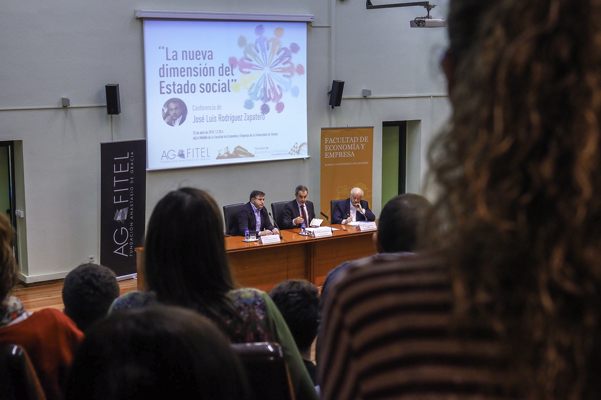 José Luis Rodríguez Zapatero, presidente del Gobierno de España desde el 16 de abril de 2004 al-21 de diciembre de 2011, impartió la conferencia “La nueva dimensión del Estado Social”, en el aula Magna de la Facultad de Economía y Empresa de la Universidad de Oviedo,