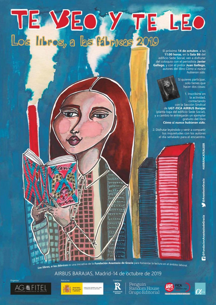 El próximo lunes, 14 de octubre, el periodista y poeta Javier Gallego y, su hermano, el pintor Juan Gallego inaugurarán en la planta de Airbus- Barajas (Madrid) la sexta edición de Los libros, a las fábricas. Un proyecto diseñado por el Centro Documental de la Fundación Anastasio de Gracia para incrementar el número de lectores de nuestro país, donde cerca de un 40 % de la población manifiesta sin rubor «no haber leído nunca un libro».