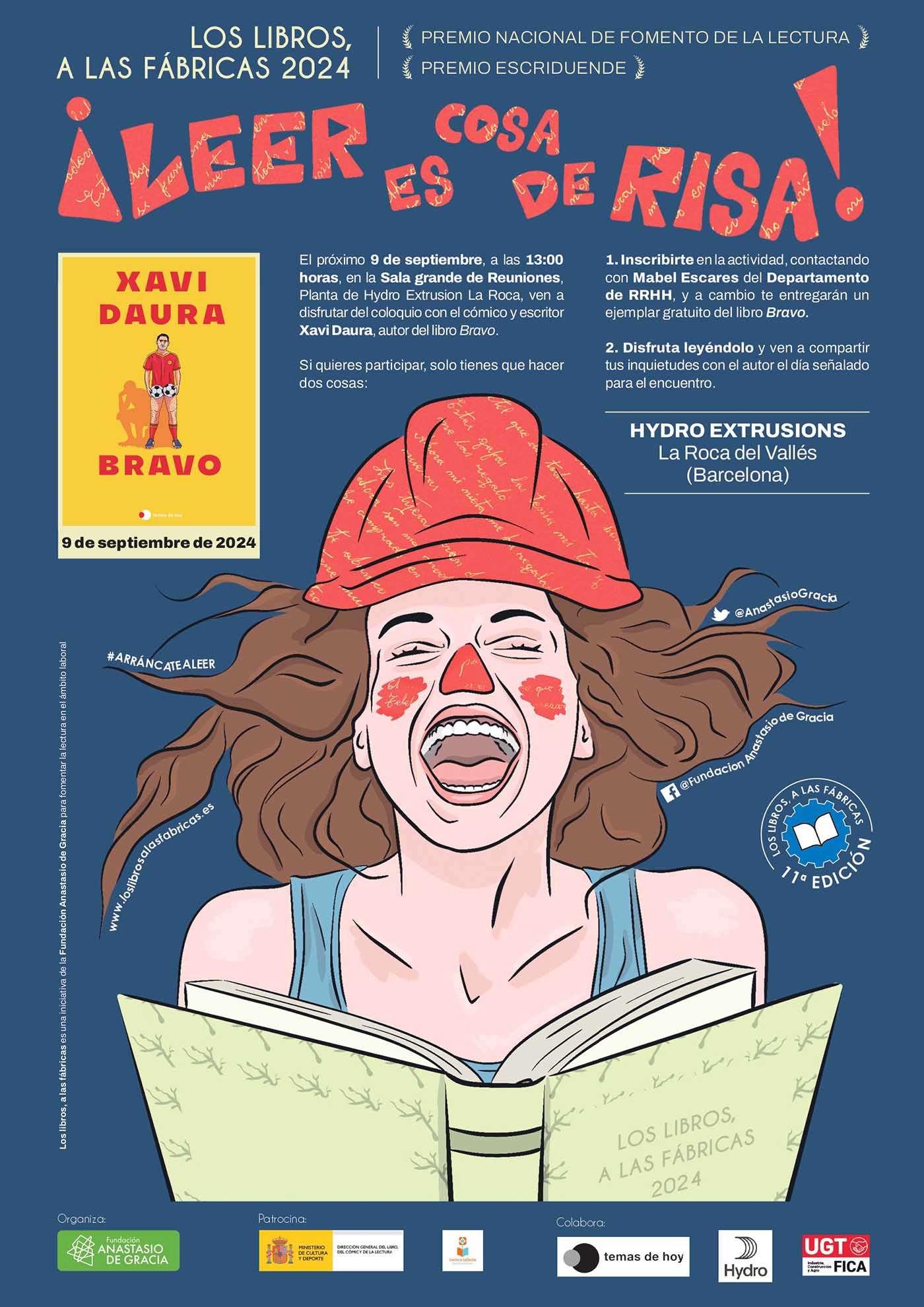 «Los libros, a las fábricas» comienza hoy su undécima edición, que este año se dedica al humor bajo el eslogan ¡Leer es cosa de risa!, con el coloquio que mantendrá el humorista y escritor Xavi Daura con la plantilla de la factoría de Hydro Extrusions en La Roca del Vallés, en la que se tratará su libro Bravo, que fue repartido al inicio de la campaña, hace más de un mes, entre los trabajadores y trabajadoras de la planta que lo solicitaron.