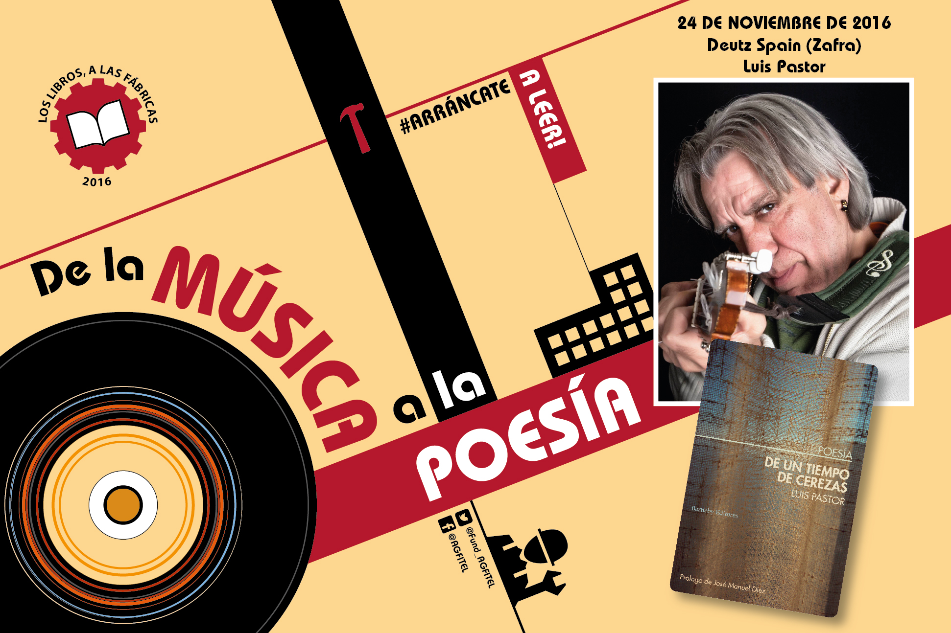 El próximo día 24 de noviembre, jueves, el cantautor y poeta Luis Pastor se encontrará con los trabajadores de DeutzSpain en Zafra, con los cuales mantendrá un coloquio en torno a su obra De un tiempo de cerezas. Este acto forma parte de la campaña de Los libros, a las fábricas, 2016, organizada por la Fundación Anastasio de Gracia-FITEL, y que este año bajo el título «De la música, a la poesía» llevará a nueve cantautores y poetas a otras tantas factorías industriales con la misión de fomentar la lectura en verso.