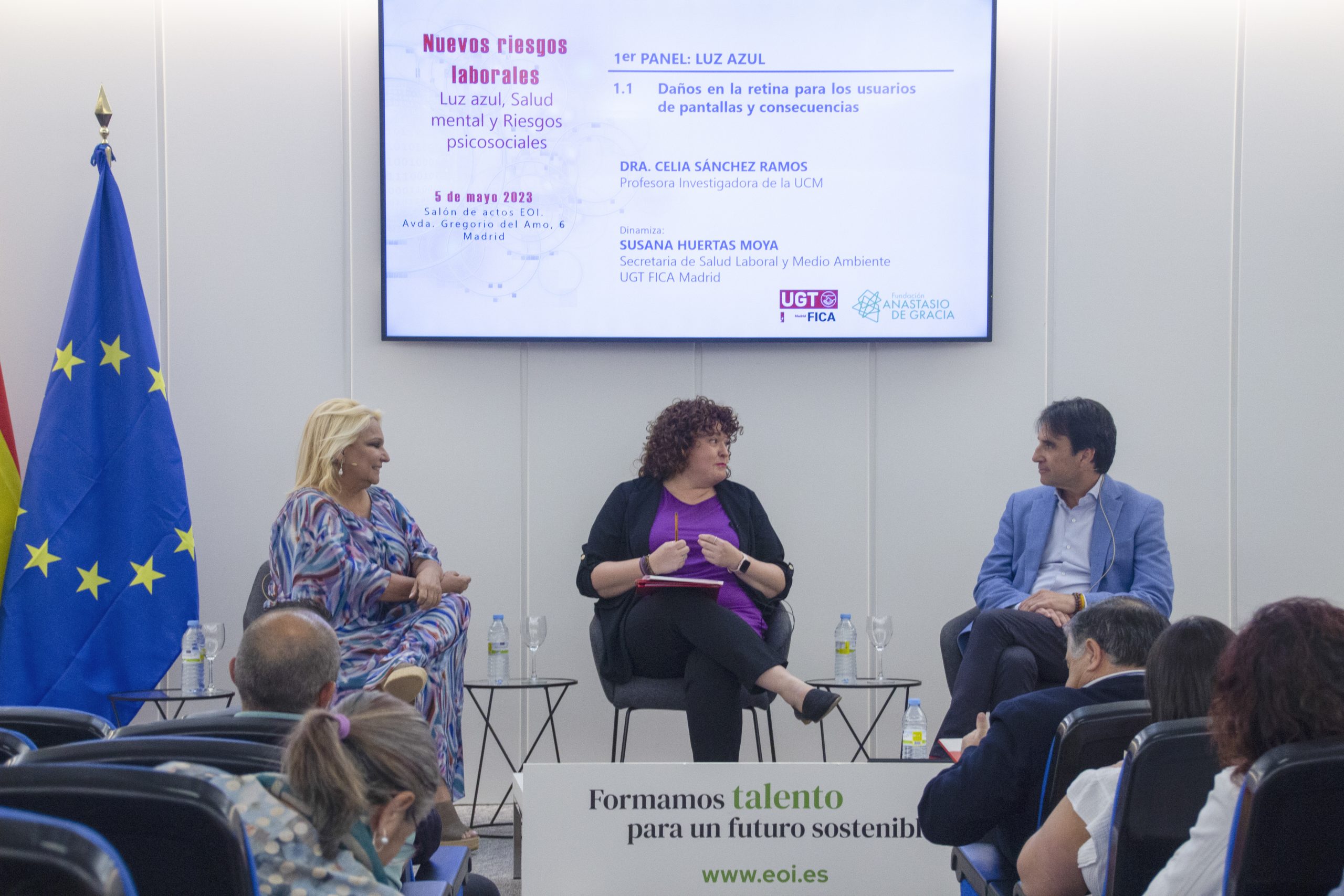 El acto se ha dividido en dos paneles, dinamizados por la secretaria de Salud Laboral y Medio Ambiente de UGT FICA Madrid, Susana Huertas. El primero de ellos se ha centrado en el debate de «Los daños en la retina para los usuarios de pantallas y sus consecuencias», con la intervención de la profesora investigadora de la Universidad Complutense de Madrid, Celia Sánchez, y «Las medidas necesarias en las empresas para reducir los riesgos de los trabajadores digitales», a cargo de Nilo García, Global CEO de Reticare.