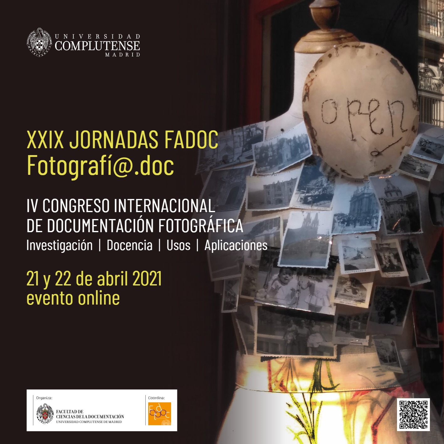 Las XXIX Jornadas FADOC y IV Congreso Internacional de Documentación Fotográfica, organizadas por la Facultad de Ciencias de la Documentación de la UCM y el grupo de investigación Fotodoc, con el título Fotografí@.doc: Investigación / Docencia / Usos / Aplicaciones, están dirigidas a los estudiantes de la Facultad, a los investigadores y a profesionales del ámbito de la documentación fotográfica (bibliotecas, archivos, museos y centros de documentación), así como a toda persona interesada en el patrimonio fotográfico. Las Jornadas se estructuraron en cuatro áreas: Instituciones, Investigación, Fotografía y Medios, Mujer y Fotografía.