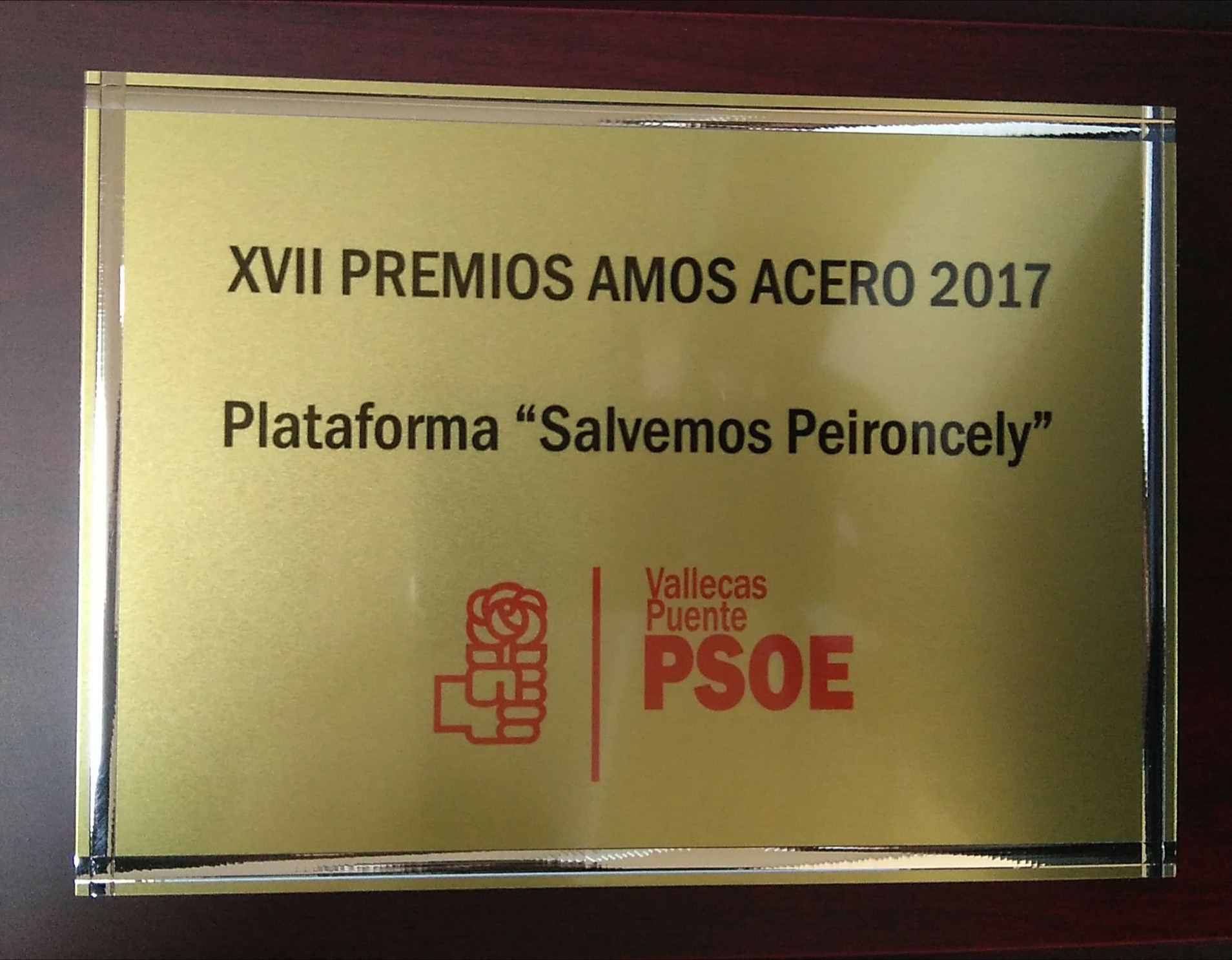 El director de la Fundación Anastasio de Gracia, Félix González Argüelles, acompañado del coordinador del Centro Documental de la misma, Uría Fernández, acudieron a la Casa del Pueblo del Puente de Vallecas para recoger en nombre de la Plataforma #SalvaPeironcely10 uno de los galardones concedidos por la Comisión Ejecutiva de la Agrupación Socialista de este distrito obrero madrileño y que con el nombre del alcalde socialista de Vallecas, Amós Acero, quieren honrar la figura del histórico dirigente socialista fusilado durante el franquismo.