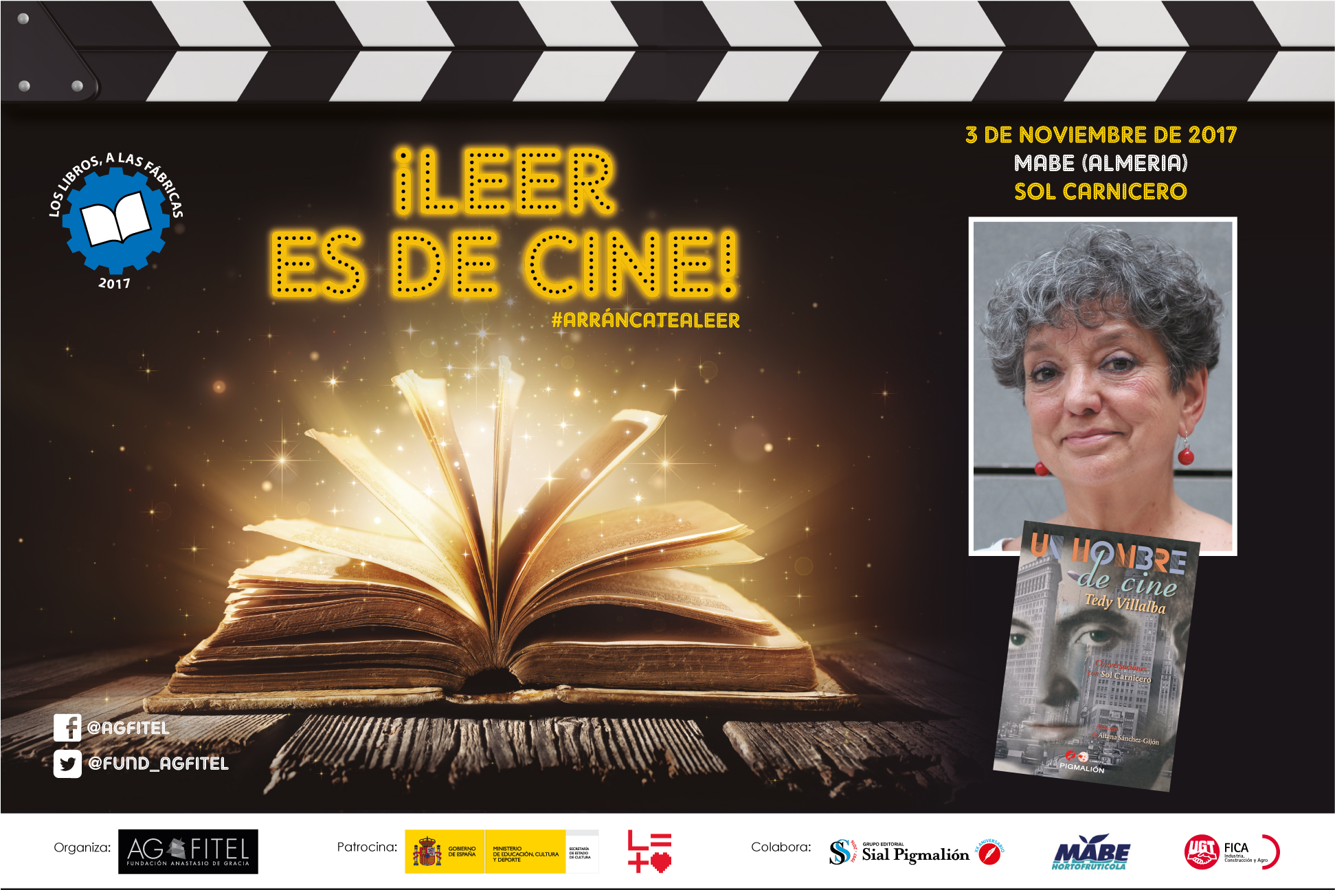 La productora Sol Carnicero se encontrará con las trabajadoras de Hortofrutícola MABE, en la sede que la empresa tiene en El Ejido (Almería), con las cuales intercambiará impresiones sobre su libro «Un hombre de cine. Tedy Villalba», en el que se narra, a partir de las conversaciones de la autora con el productor de cine, la apasionante historia de este personaje que participó en casi todas las superproducciones que los grandes estudios de Hollywood rodaron en nuestro país en la segunda mitad del siglo XX. Este acto forma parte de la campaña de «Los libros, a las fábricas 2017», organizada por la Fundación Anastasio de Gracia-FITEL, y que este año bajo el título ¡Leer es de cine! llevará a once autores a otras tantas factorías industriales con la misión de fomentar la lectura.