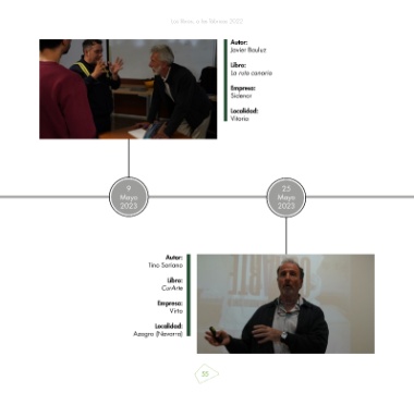 Los libros, a las fábricas 2022 Autor: Javier Bauluz Libro: La ruta canaria Empresa: Sidenor Localidad: Vitoria 9 25 Mayo Mayo 2023 2023 Autor: Tino Soriano Libro: CurArte Empresa: Virto Localidad: Azagra (Navarra) 55