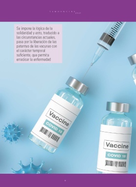 T E N D E N C I A S 2 02 1 Se impone la lógica de la solidaridad y esto, traducido a las circunstancias actuales, pasa por la liberación de las patentes de las vacunas con el carácter temporal suficiente, que permita erradicar la enfermedad 12
