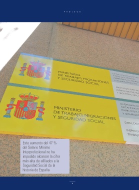 P R Ó L O G O Este aumento del 47 % del Salario Mínimo Interprofesional no ha impedido alcanzar la cifra más alta de afiliados a la Seguridad Social de la historia de España 19